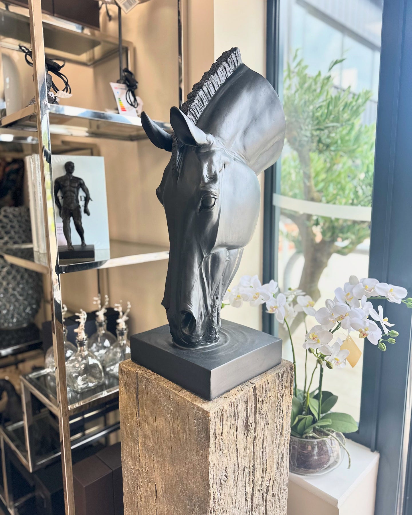 Elegantly crafted from polyresin, this exquisite sculpture beautifully captures a black horse drinking water.