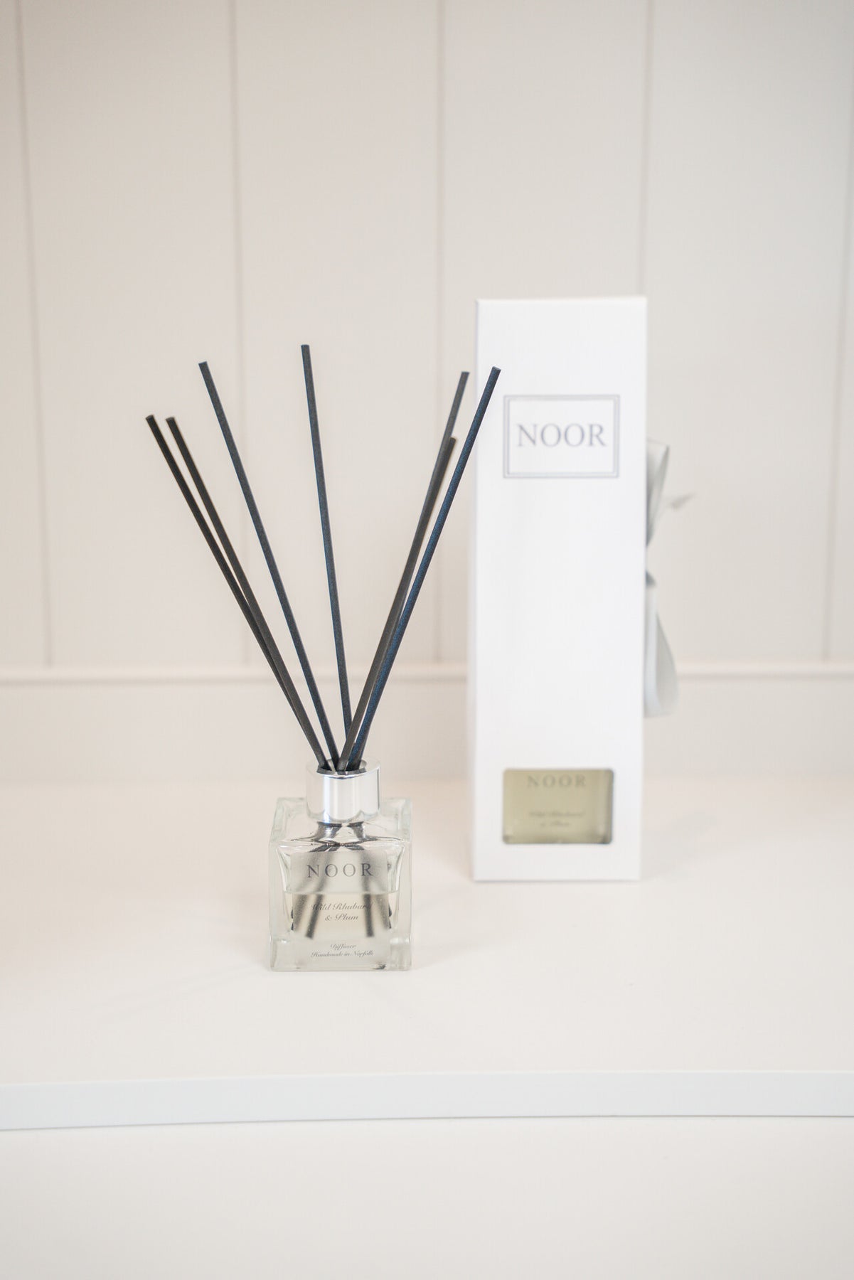 Our 100ml diffusers are presented in elegant clear glass bottles with a sleek silver cap and paired with premium black reeds. Each diffuser is beautifully packaged in a white box for a refined touch.