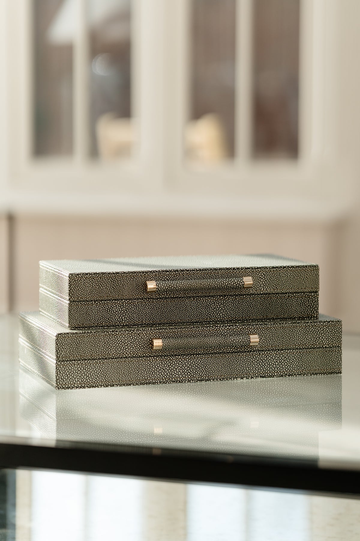 Our Set of 2 Grey Shagreen Storage Boxes are crafted from luxurious faux shagreen leather and finished with elegant bar detailing. Perfect for storing jewellery or small essentials, these decorative boxes look beautiful styled on a dressing table, console, or sideboard while keeping your space organised.